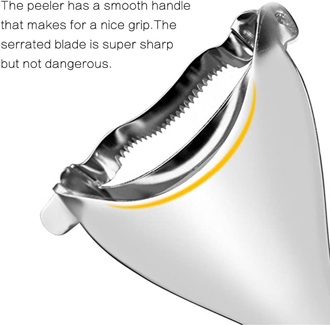 has a ergonomic high-tech polished stainless steel handle that makes for a nice grip.The serrated blade is super sharp but not dangerous, and there is a hole in handle for convenient hanging storage.