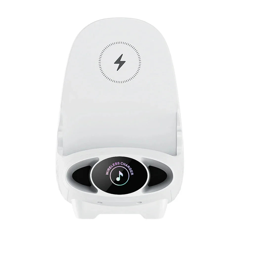Unique and novel, the wireless charging/mobile phone holder function can be placed horizontally or vertically, and there is a sound hole at the bottom to make the sound more three-dimensional when the phone is playing.