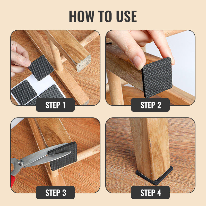 Ensure furniture legs are clean, dry, and free of debris before applying pads for optimal adhesion.
