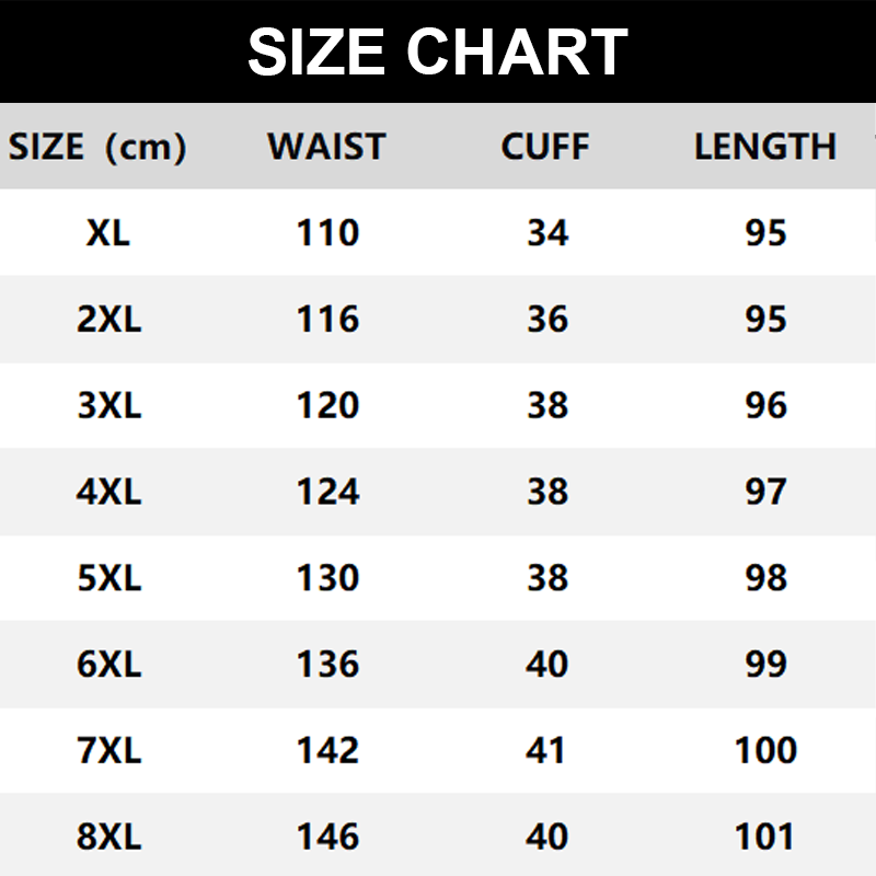 Size: XL, 2XL, 3XL, 4XL, 5XL, 6XL, 7XL, 8XL